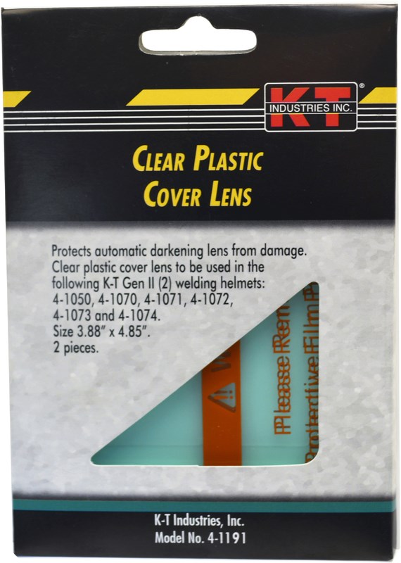 - Clear plastic cover lens to be used in the K-T Gen II (2) welding helmets: 4-1050, 4-1070, 4-1071, 4-1072, 4-1073 & 4-1074
