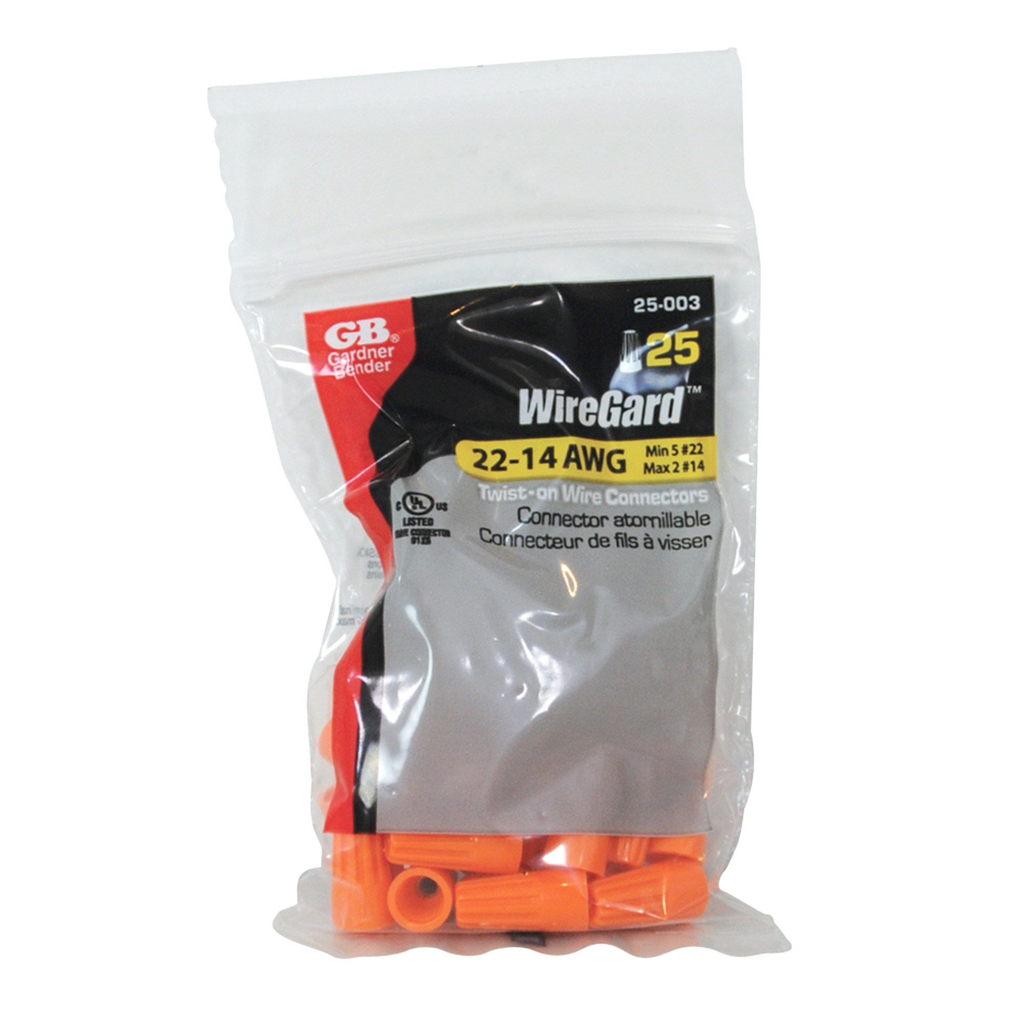GARDNER BENDER WIREGARD SCREW-ON WIRE CONNECTOR - ORANGE (GB-3)Gardner Bender WireGard orange (GB-3) screw-on wire connectors are color-coded for quick identification and designed for copper-to-copper wire splicing. The square-wire spring design ensures tight, reliable connections, while the flame-retardant polypropylene shell provides excellent insulation and durability.