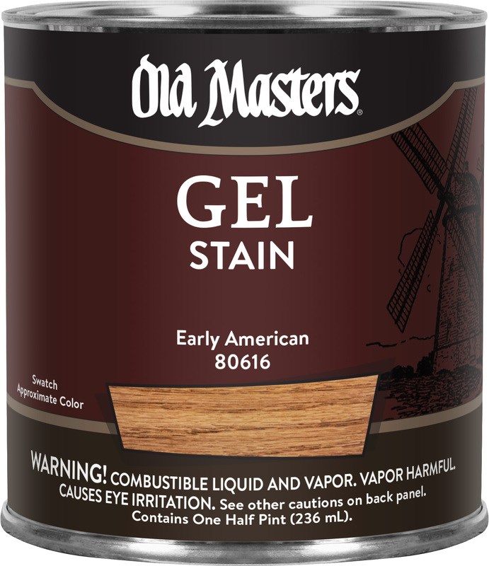 OLD MASTERS GEL STAIN - EARLY AMERICANOld Masters Gel Stain in Early American is an oil-based gel stain formulated for use on wood, fiberglass, metal, and composition surfaces. The thick gel formula prevents drips and runs, making it ideal for vertical surfaces and hard-to-stain woods like pine, birch, maple, poplar, and cherry. Early American produces a warm, medium-brown tone reminiscent of colonial-era woodwork.