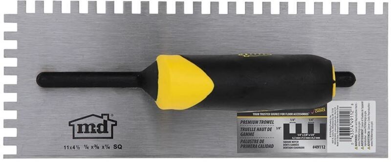 Quality trowel measuring 11" x 4-1/2" designed for the professional installer.  Hardened and tempered steel blade, grounded and polished for long lasting durability.