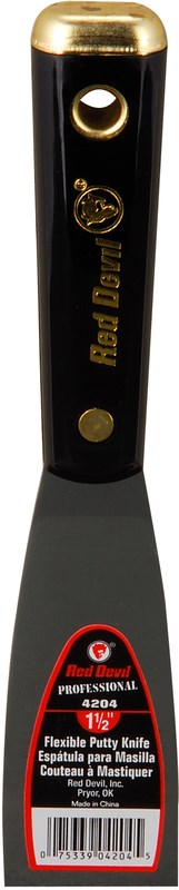 Professional quality putty knife with a black nylon, solvent-resistant handle that is designed for maximum safety and dependability. High-carbon, precision-ground steel blade is lacquered to prevent rust and extends through handle.