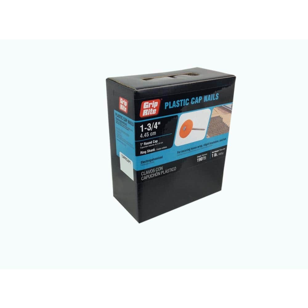 PRIME SOURCE PLASTIC CAP ROOFING NAIL - 1-3/4"Prime Source 1-3/4" plastic cap roofing nails provide a secure hold for house wrap, rigid insulation, and roofing felt. The round plastic cap distributes force over a wider area to prevent pull-through in soft materials. The ring shank grips wood fibers for superior holding power, and the electro-galvanized coating resists corrosion.