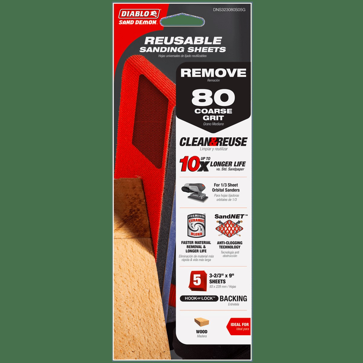 DIABLO SAND DEMON 1/3 SHEET REUSABLE SANDING SHEET - 80 GRIT (COARSE), 5-PACKDiablo Sand Demon reusable sanding sheets deliver up to 10X the life of standard sandpaper, so 5 sheets replace up to 50 conventional sheets. The advanced SandNET open-net design resists clogging for superior dust extraction and longer cutting life. Simply shake, vacuum, or rinse to clean and reuse.