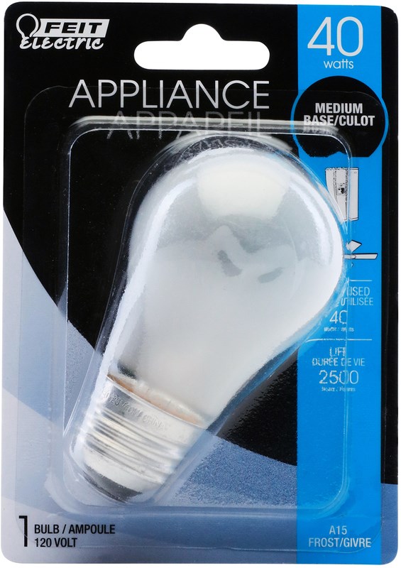 FEIT ELECTRIC 40W APPLIANCE BULB - A15 FROST FINISHPurpose-built for appliance use, this Feit Electric 40W A15 incandescent bulb delivers reliable 280-lumen output in refrigerators, ovens, microwaves, and ceiling fans. The frosted finish diffuses light evenly to reduce glare inside enclosed fixtures.