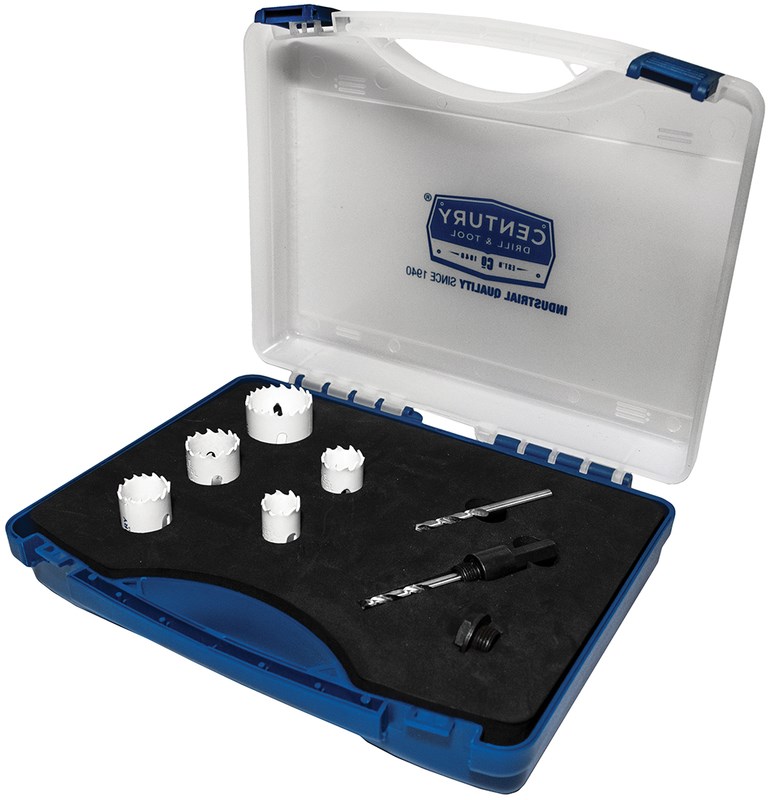 Includes 3/4", 7/8", 1", 1-1/8", 1-1/2" hole saws, 1 arbor with 2 pilot drills & adapter nut