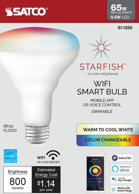 9.5W, BR30 LED indoor flood, RGB & turntable white, 120V, 800 lumens, equivalent to 65W incandescent, 25,000 hours, damp location rate