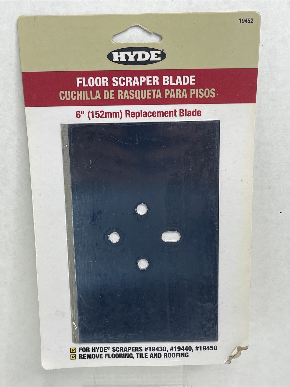 HAMMER SCRAPER REPLACEMENT BLADE - 6"Hyde replacement blade for hammer scrapers. High carbon steel construction with two sharpened edges provides long-lasting performance. Blades can be resharpened for extended use.