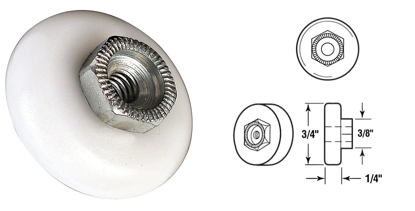 M 6001 is a 3/4" tub & shower door nylon ball bearing roller with a flat edged wheel. It has a threaded hex head hub that uses an 8-32 x 3/8" long Phillips binder head machine screw to fasten it to the door bracket. Used on many different tub and shower top roller systems.