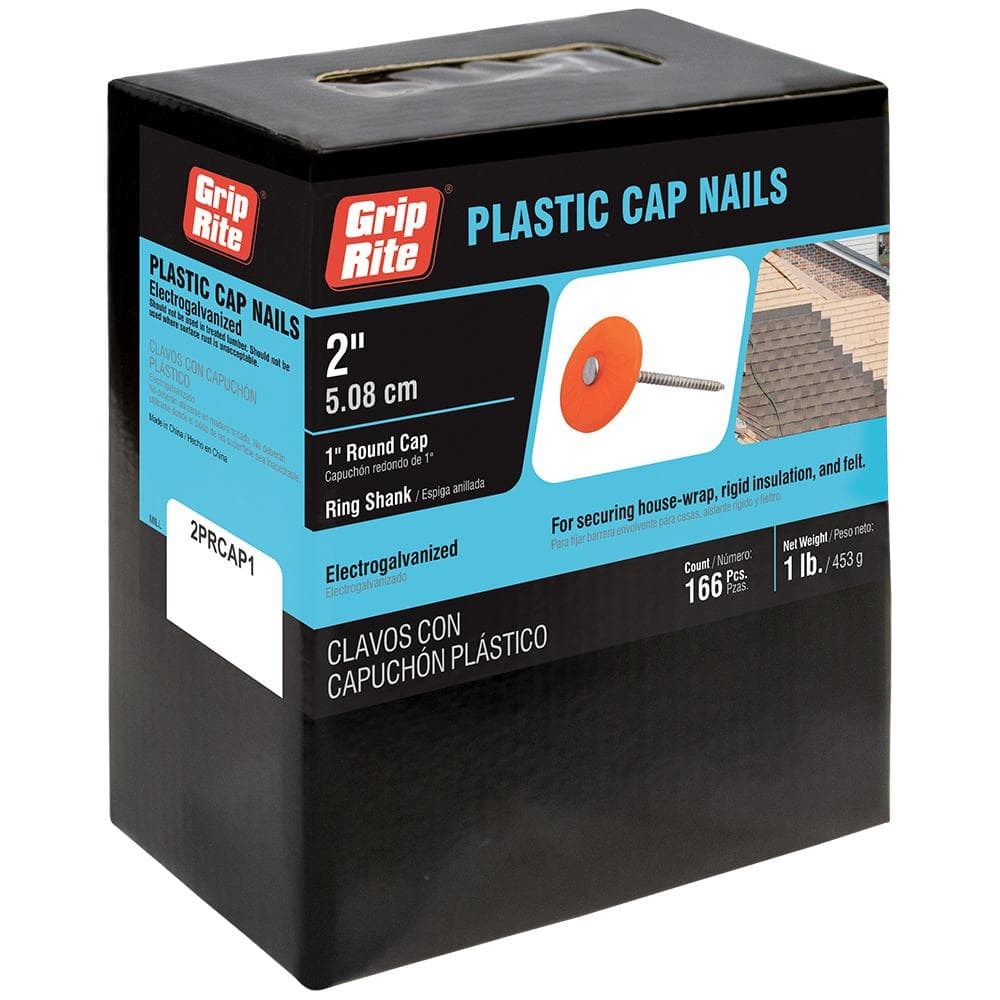 PRIME SOURCE PLASTIC CAP ROOFING NAIL - 2"Prime Source 2" plastic cap roofing nails provide a secure hold for house wrap, rigid insulation, and roofing felt. The round plastic cap distributes force over a wider area to prevent pull-through in soft materials. The ring shank grips wood fibers for superior holding power, and the electro-galvanized coating resists corrosion.