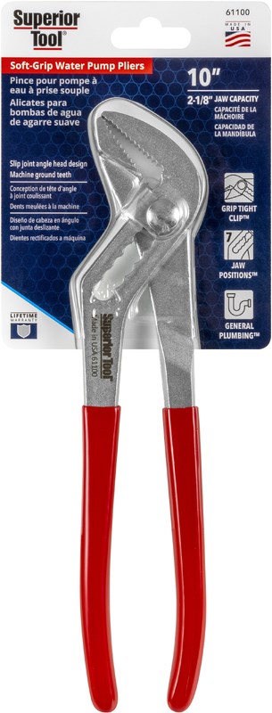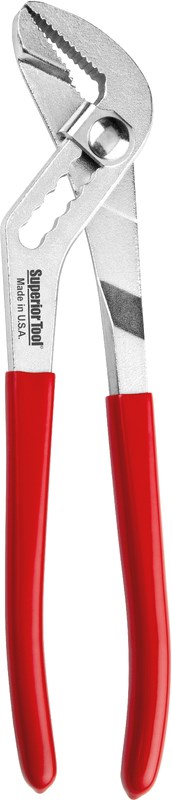 SUPERIOR TOOL 10" WATER PUMP PLIERSThe Superior Tool 61100 Water Pump Pliers feature the proprietary Grip Tight clip that pulls the pivot bolt into alignment under pressure for a secure, non-slip grip. These drop-forged pliers are precision heat-treated for durability.