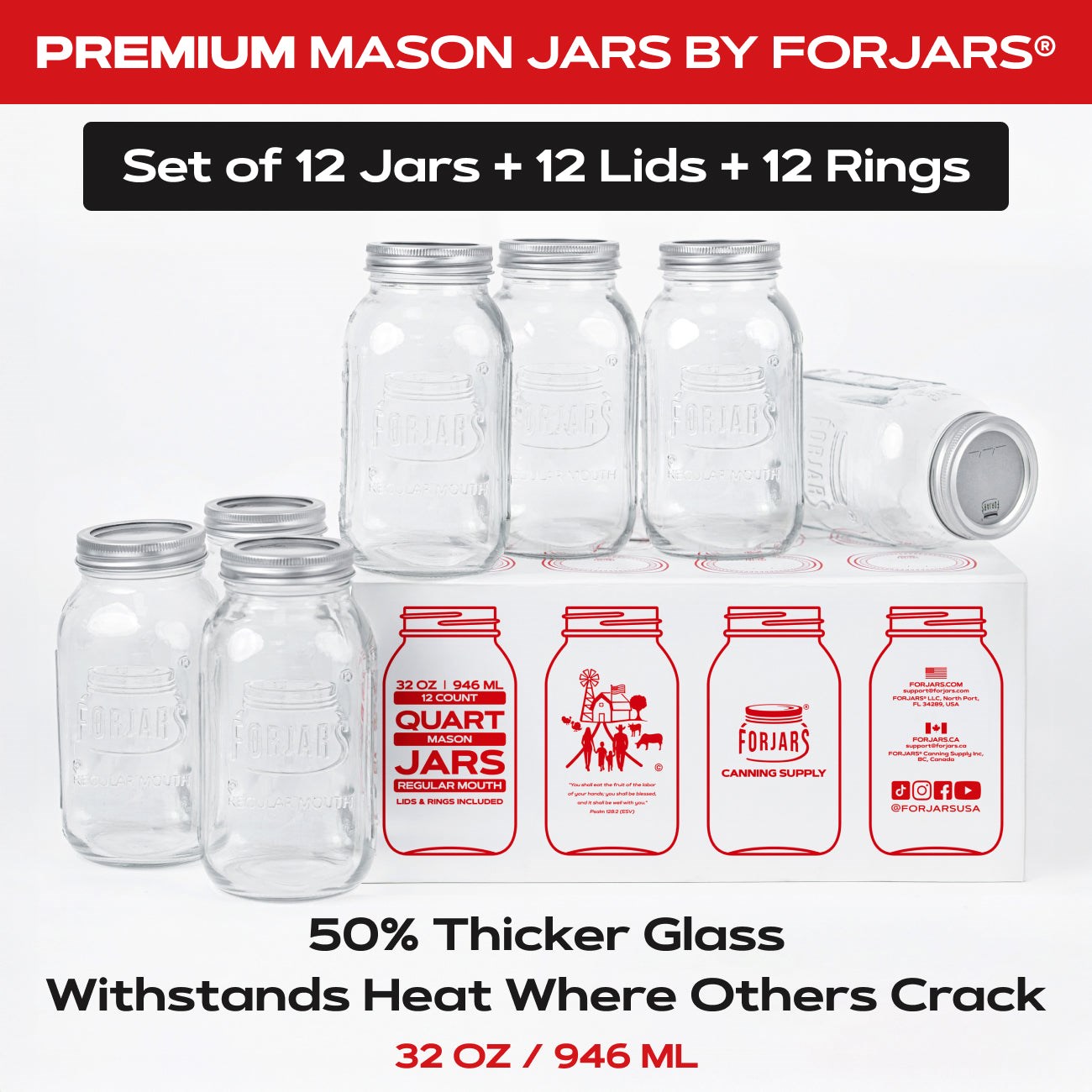 (12 PACK)Premium quart-size glass canning jars from Forjars for preserving larger batches of fruits, vegetables, sauces, and pickles. These 32 oz jars feature thick, lead-free glass that is canner safe for water bath and pressure canning.