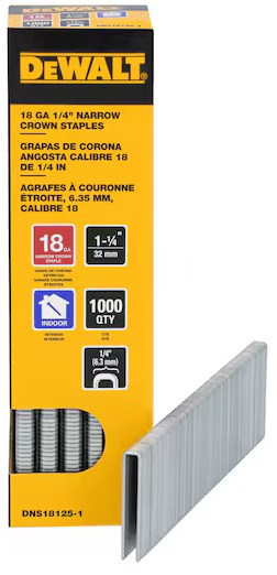 DEWALT 18-GAUGE NARROW CROWN FINISH STAPLES - 1/4" x 1-1/4"These DeWalt 18-gauge narrow crown staples deliver reliable fastening for cabinet making, furniture building, and finish carpentry. The chisel point design provides clean penetration and reduces material splitting.