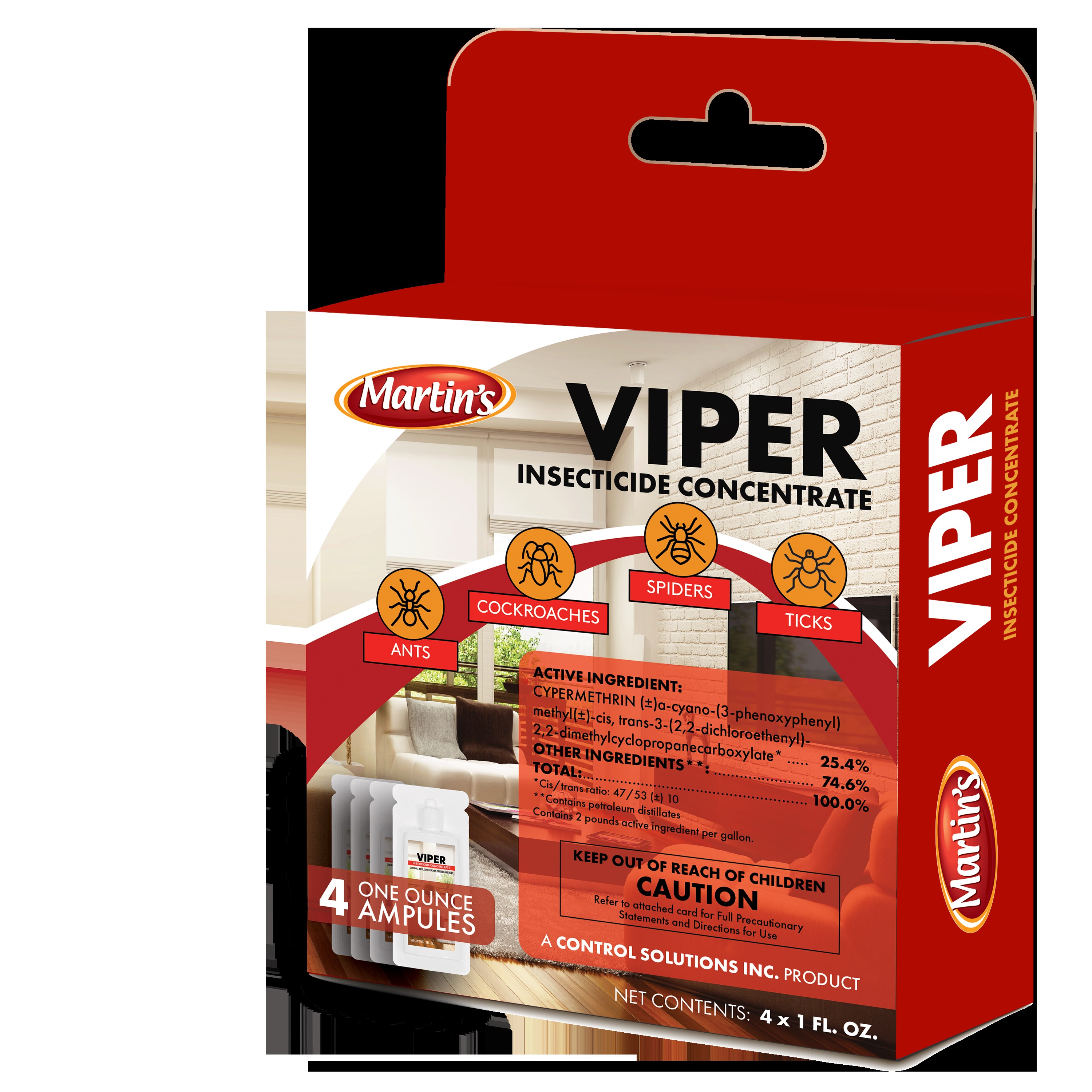 MARTIN'S VIPER INSECTICIDE CONCENTRATE - 4 OZMartin's Viper is a professional-grade emulsifiable concentrate with 25.4% Cypermethrin for long-lasting residual control of a wide range of pests. This 4 oz bottle provides enough concentrate for multiple applications when mixed with water at recommended dilution rates.