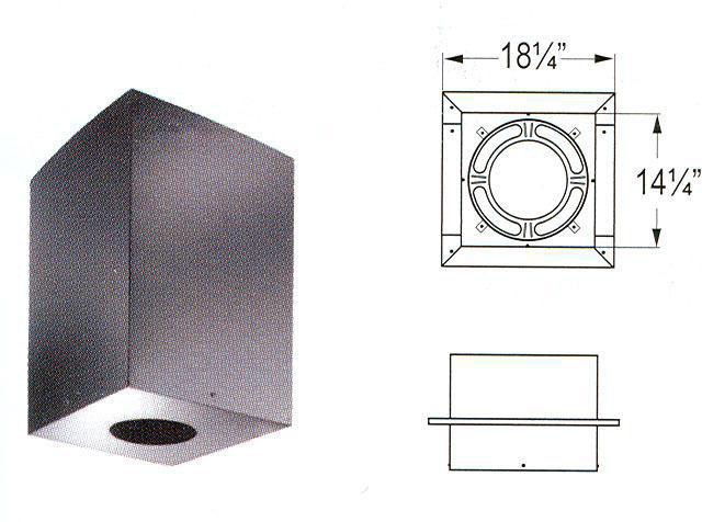 This square ceiling support box is used with flat, vaulted, or cathedral ceilings. It is designed to stay cool on the outside, to provide a hot draft on the inside, to boost stove efficiency, and to provide for a fire-safe design that protects both the chimney and the building.