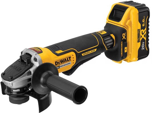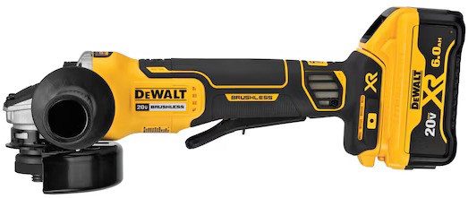 DEWALT 20V GRINDER KIT - 4.5"The small angle grinder has a brushless motor that elongates motor life and requires no time changing out worn brushes. The wheel stops within 2 seconds or less. Its Kickback Brake engages maximum force to stop the wheel when there is a pinch, stall, or bind-up to reduce kickback, and will shut off for further protection.