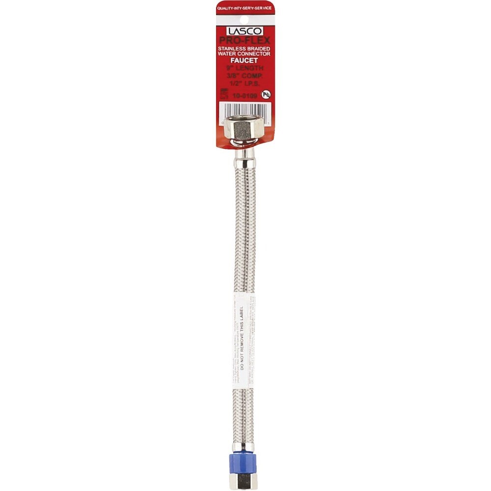 BRAIDED STAINLESS STEEL FAUCET CONNECTOR - 3/8" COMP x 1/2" FIP, 9"Connect your faucet to the water supply with this flexible braided stainless steel connector from Larsen Supply. The durable stainless steel braid with poly inner core provides reliable, leak-free performance, while the flexible design makes installation easy even in tight spaces.