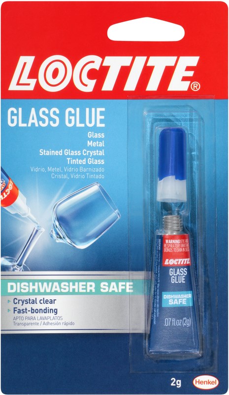 - Loctite® Glass Glue dries clear, sets without clamping and is dishwasher safe.