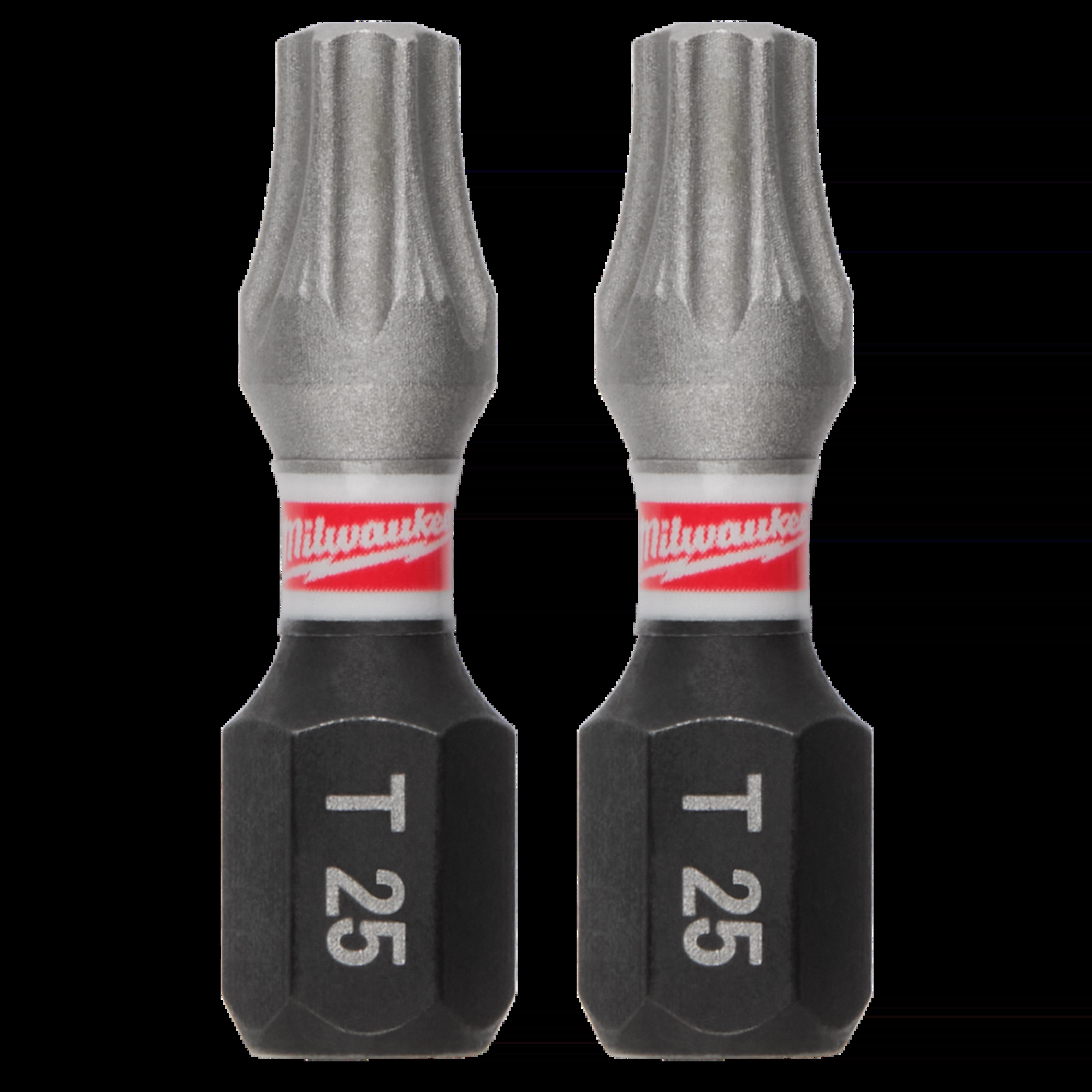 MILWAUKEE SHOCKWAVE IMPACT DUTY TORX BIT - T25, 2-PACKBuilt for the demands of impact driving, this Milwaukee Shockwave Torx bit delivers up to 50x longer life than standard impact bits. The proprietary Alloy76 steel is custom heat-treated per tip size, and the Wear Guard laser-hardened tip protects fit throughout the life of the bit. The optimized Shockzone geometry absorbs peak torque to prevent breaking.