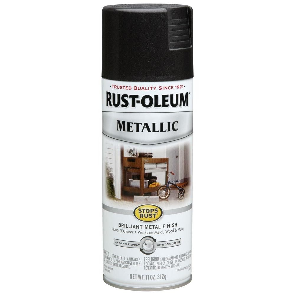 The RustOleum Stops Rust 11 oz. Metallic Spray Paint has a formula that helps prevent rust and can be used on automobiles, bikes and fixtures. This paint provides a rich metallic color for your projects. This paint contains weather-resistant metallic flakes and provides rust protection for heavily used objects.