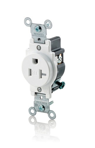 SINGLE OUTLET, TAMPER-RESISTANT, WHITE - 20AThis Leviton commercial specification grade 20-amp single receptacle is designed for dedicated circuit applications requiring higher amperage. Features tamper-resistant design for child safety and a shallow profile that maximizes wiring space in the outlet box.