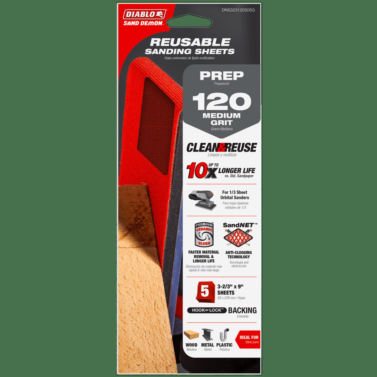 DIABLO SAND DEMON 1/3 SHEET REUSABLE SANDING SHEET - 120 GRIT (MEDIUM), 5-PACKDiablo Sand Demon reusable sanding sheets deliver up to 10X the life of standard sandpaper, so 5 sheets replace up to 50 conventional sheets. The advanced SandNET open-net design resists clogging for superior dust extraction and longer cutting life. Simply shake, vacuum, or rinse to clean and reuse.