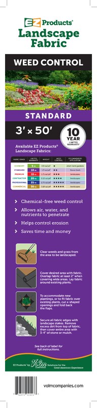 VOLM SPUNBOND LANDSCAPE FABRIC 3 FT x 50 FTVolm Companies spunbonded landscape fabric provides effective weed prevention while allowing water and nutrients to pass through to the soil. This medium-weight option offers increased durability for areas with heavier foot traffic or larger aggregate cover.