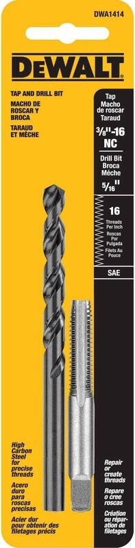 DEWALT DRILL AND TAP SET - 3/8-16 NCCreate and repair 3/8-16 NC (National Coarse) internal threads in metal with this DeWalt 2-piece drill and tap set. Includes a matched 5/16" black oxide drill bit and high-carbon steel tap for precise, efficient thread cutting.