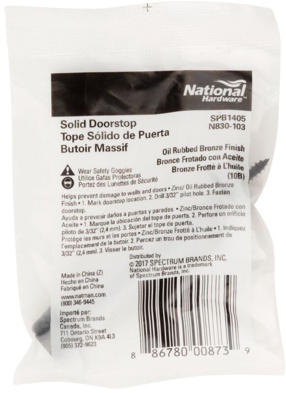 NATIONAL 1405 RIGID DOOR STOP, OIL RUBBED BRONZE - 3"National Hardware 1405 rigid door stop prevents doors from opening too far and damaging walls or molding. The oil rubbed bronze finish complements modern hardware and decor.
