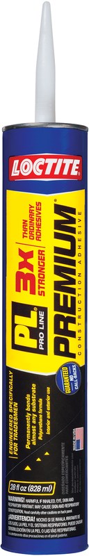 Loctite PL Premium provides superior adhesion to most common construction materials. It can be used for interior or exterior projects and is three times as strong as conventional solvent based construction adhesives. It is also waterproof, paintable and cures even in cold temperatures. Ideal for sub floor installations.