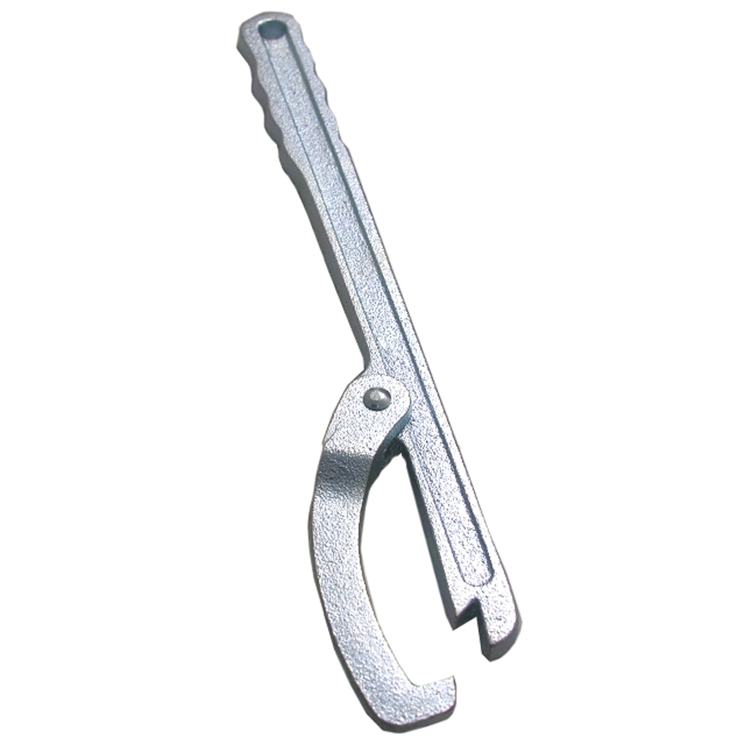 The Larsen (LASCO) hinged jaw lock nut wrench is a multi-purpose plumbing tool designed for under-sink and toilet work. The articulating hinged jaw automatically adjusts to grip sink basket strainer locknuts, toilet tank spud nuts, and flush valve locknuts of various sizes without manual adjustment. The long metal handle provides the leverage needed to loosen stubborn or corroded fittings in tight spaces where standard tools cannot reach.