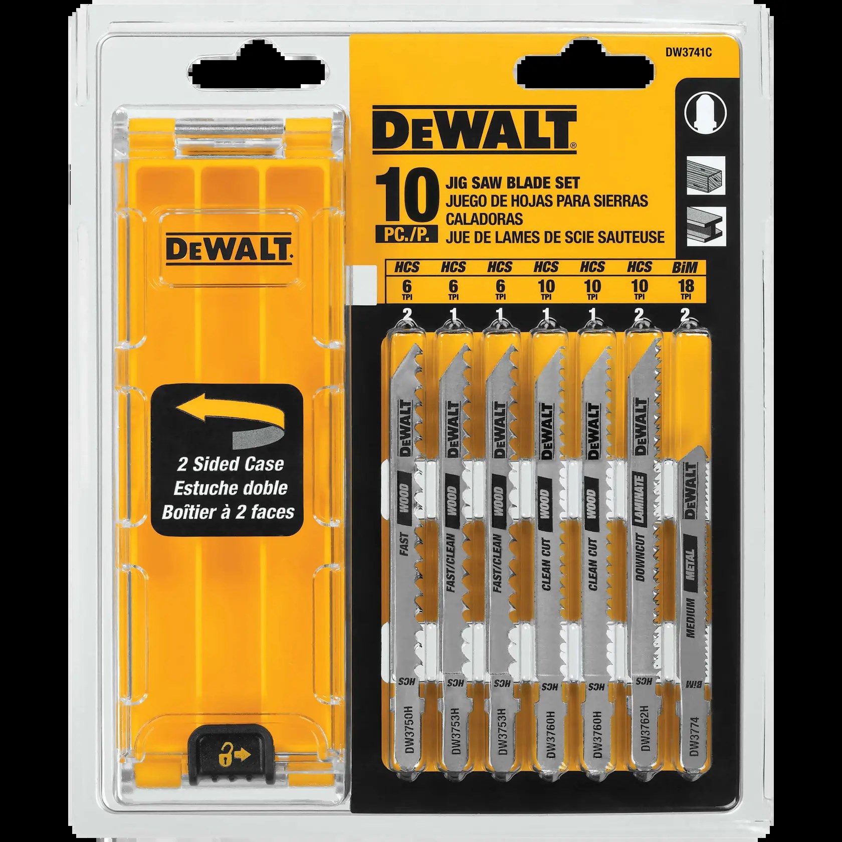 The DEWALT DW3741C T-Shank Jig Saw Blade Set provides a ready assortment of blades for cutting wood and metal. All blades feature T-shank fitment compatible with DEWALT, Bosch, and most other T-shank jig saws. The set includes 6 TPI HCS blades (4 in. long) for fast wood cuts, 10 TPI HCS blades (4 in. long) for general wood cutting, and 18 TPI bi-metal blades (3 in. long) for metal cutting. Includes a storage case for organized transport and storage.