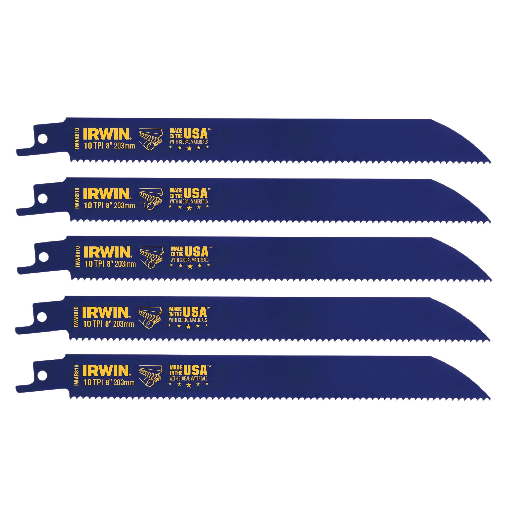 IRWIN WELDTEC 8" RECIPROCATING SAW BLADES - 10 TPI (5-PACK)This 5-pack of 8" blades features 10 teeth per inch for versatile cutting in pipe, carbon steel, stainless steel, plastic, and composition materials 1/8" to 1/2" thick. Irwin WeldTec blades use bi-metal construction with 8% cobalt high-speed steel teeth for longer cutting life in demanding applications.