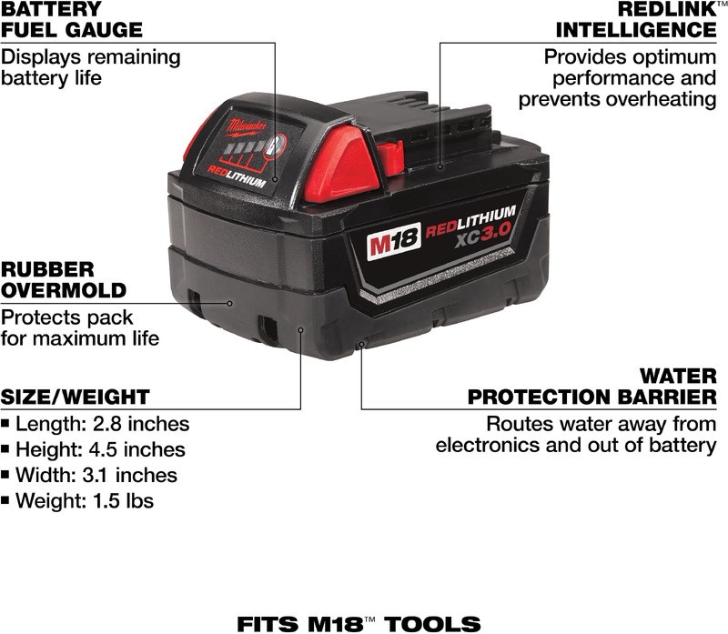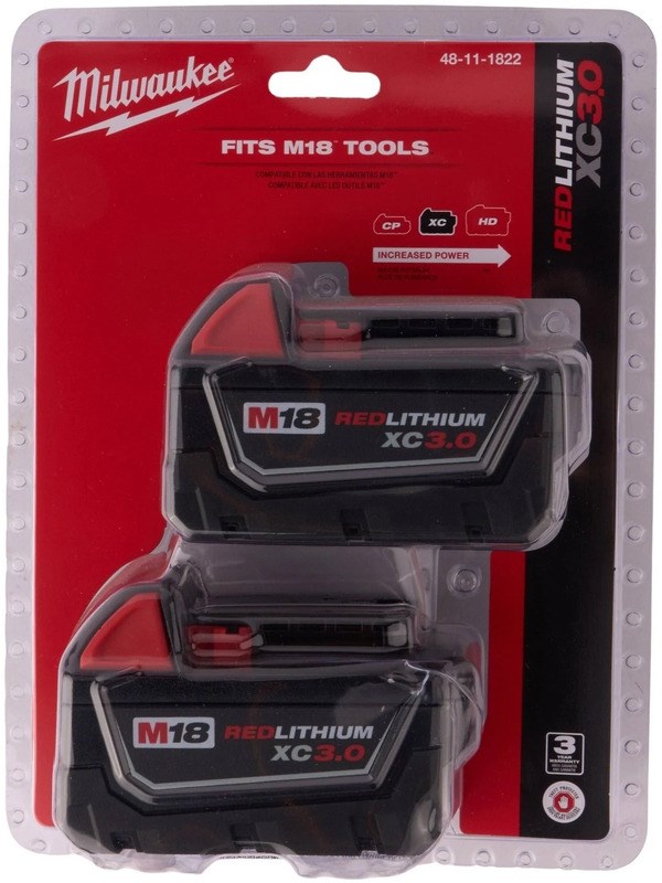MILWAUKEE M18 REDLITHIUM XC3.0 BATTERY 2-PACKThe Milwaukee M18 REDLITHIUM XC3.0 Battery 2-Pack delivers 3.0 Ah of runtime in a compact package that works with all Milwaukee M18 cordless tools. Built with REDLITHIUM intelligence, these batteries feature overload and discharge protection to extend battery life and protect your tools.