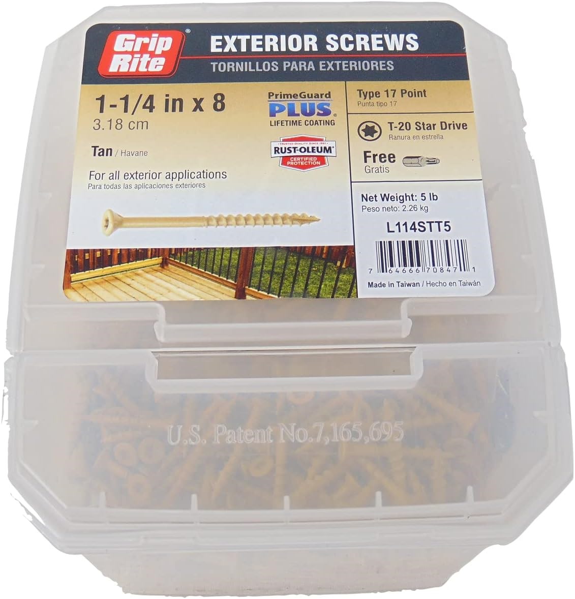GRIP-RITE EXTERIOR SCREW, TAN - #8 X 1-1/4", 5 LBGrip-Rite Exterior Screws with PrimeGuard Plus coating deliver reliable, long-lasting performance in outdoor applications. The proprietary polymer coating meets ASTM B-117 salt spray standards, protecting against rust and corrosion for years of service. Perfect for fastening deck boards, trim, and light exterior attachments. The tan coating provides a warm, natural appearance on cedar, redwood, and composite decking.