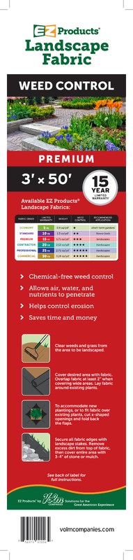 VOLM SPUNBOND LANDSCAPE FABRIC 3 FT x 50 FTVolm Companies spunbonded landscape fabric provides effective weed prevention while allowing water and nutrients to pass through to the soil. This heavier-weight option delivers enhanced durability and superior weed suppression for demanding landscape applications.