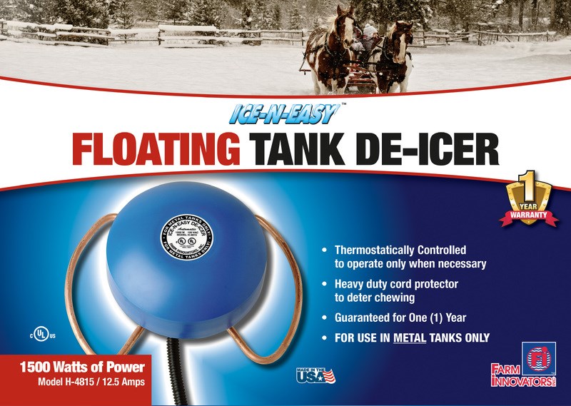 FARM INNOVATORS FLOATING TANK DE-ICERKeep livestock water from freezing with this economical floating de-icer. The thermostatically controlled heating element operates only when needed to maintain water temperature, saving energy. The floating design positions heat directly at the water surface where ice forms.