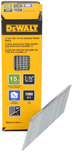 DeWalt 15 gauge angled finish nails are designed for use with DeWalt and other 34-degree DA style finish nailers. These bright steel nails feature a chisel point that reduces splitting of the workpiece for clean, professional results.